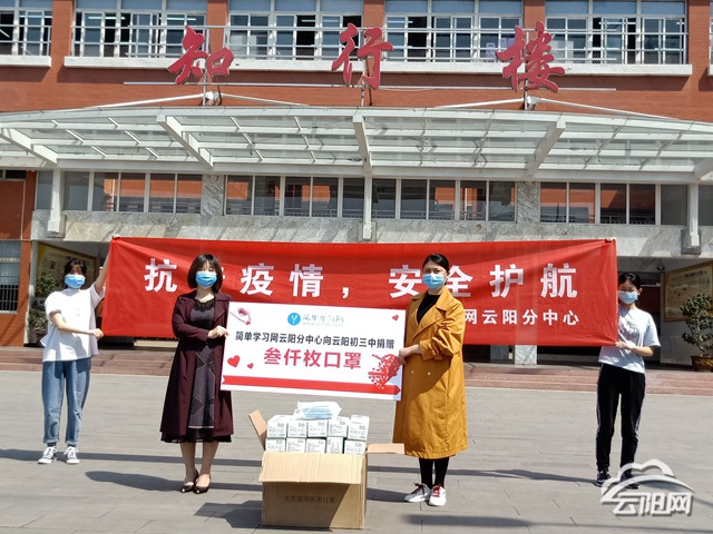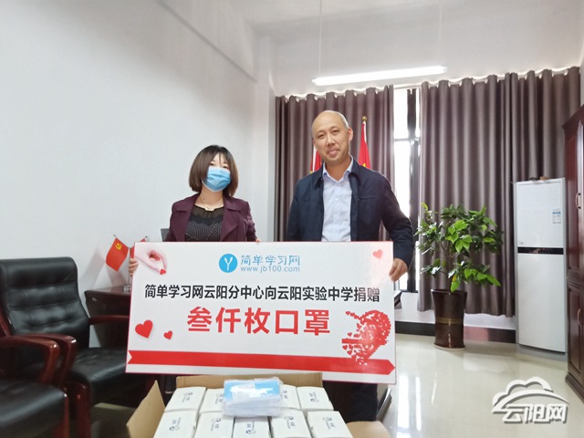 • 云阳网讯(通讯员 曾建华)近日,简单学习网云阳分中心负责人刘凌,为外国语学校、实验中学、凤鸣中学、初一中和初三中的孩子们捐赠了共计15000只一次性医用口罩,助力复课安全。