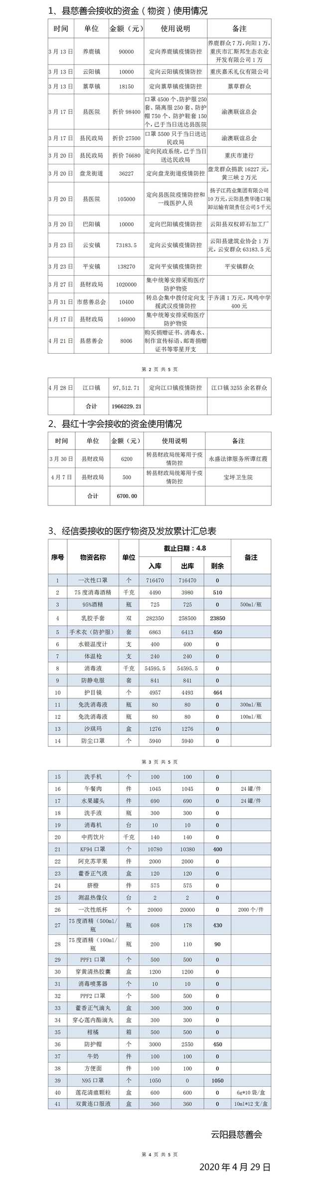 自3月12日15时至4月29日15时,云阳县慈善会共汇总接受各方面援助我县抗击新冠肺炎疫情的各类捐赠款物共4067147.51元,其中现金1227954.51元,物资折币2839193.00元。