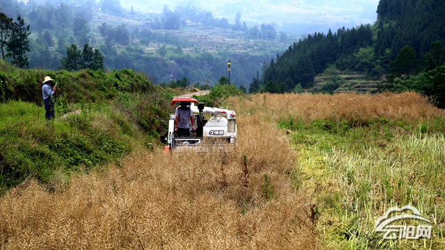 “这台联合收割机以前只能收割水稻、小麦和高粱,我们更换了割台,对这台收割机进行了改造,现在也能实现机收油菜,一次性完成油菜割荚、脱粒等环节,并将秸秆粉碎还田,既高效又环保。未来我们将继续提高农业机械化水平,逐步破解制约油菜生产耕、种、播、收全程机械化难题。”县农机推广站高级农艺师刘华介绍。