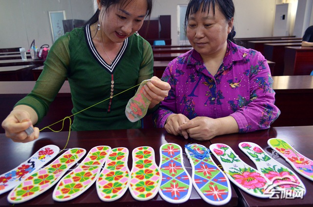 “乡村绣娘”行动源自于该镇石宝村,该村曾经是一个平均海拔超千米的高寒山区极度贫困村,根据国家扶贫“五个一批”精神,村里绝大多数村民搬迁到镇上咏梧社区居住。下山离土干什么、脱贫致富靠什么。政府引导、社会关心、市场召唤,勤劳善良的山民便亮出招招“绝活儿”。身强力壮的男劳动力养起骡子,“牲畜劳务”做得火红;妇女们则发扬传统、不丢女红,成立“巧嫂子”农村妇女培训班,组织开展针绣集训,以老带新、以贤带能、以趣带亲,通过纳鞋垫、绣枕套、补衣裤、刺文化衫等手工活儿多彩增收。“万水千山一皮骡,心灵手巧一根针”!不仅找到稳定收入之源,也激活乡村文化之本。“高手总是在民间”。只要动脑筋,不怕业不精;只要肯攀登,何愁不振兴?