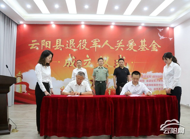 县退役军人事务局、县慈善会负责人签署了《云阳县退役军人关爱基金实施方案》。