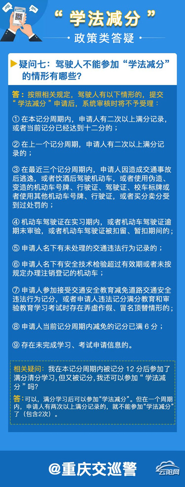 县交巡警大队介绍,只要是持有重庆市公安交管部门核发驾驶证的驾驶人均可申请参加“学法减分”,不区分驾驶证准驾类型,也不区分是否为营运车辆驾驶人。不过,驾驶人有以下情形的,提交“学法减分”申请后,系统审核时将不予受理: