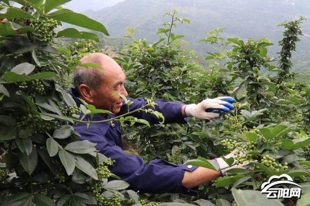 云阳网讯(记者 朱贞霓 实习生 洪琳)眼下正是花椒成熟的时节。5月25日,记者走进宝坪镇朝阳社区宝龙基地花椒园,放眼望去,26.7公顷花椒林把大山妆扮得绿意葱茏。漫步花椒林,一串串已经成熟的花椒泛着透亮的碧绿,山风吹来,椒香扑鼻。村民们正忙着对花椒树进行最后的管护。