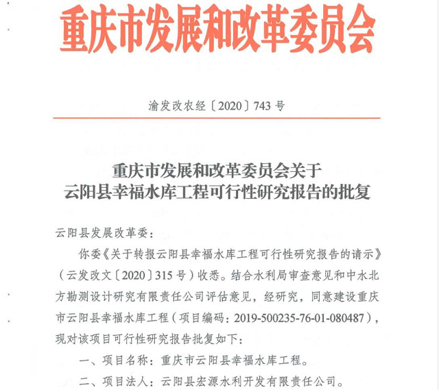 《关于云阳县幸福水库工程可行性研究报告的批复》