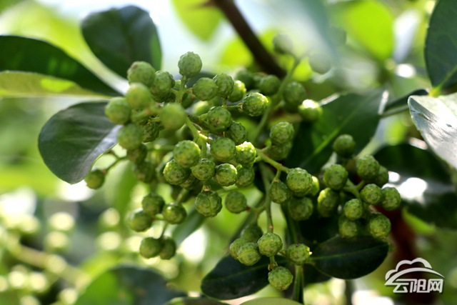 走进云安镇新建村九叶青花椒园,满山遍野的花椒树上挂满了颗粒饱满油亮的青花椒,椒香扑鼻。树下,椒农们三五成群一片忙碌……
