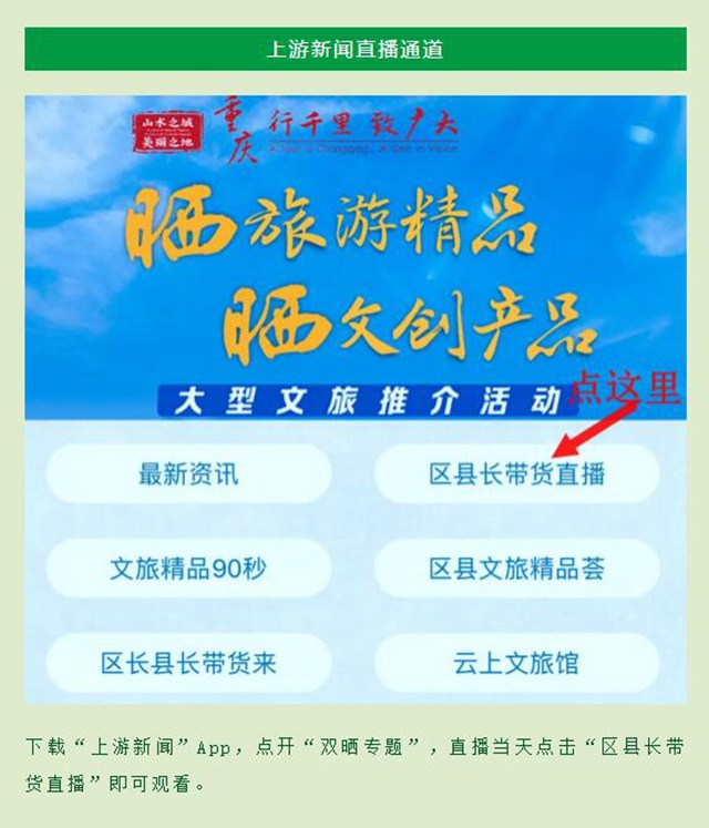 下载“上游新闻”App,点开“双晒专题”,直播当天点击“区县长带货直播”即可观看。