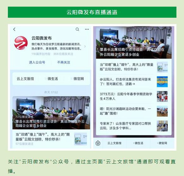 关注“云阳微发布”公众号,通过主页面“云上文旅馆”通道即可观看直播。