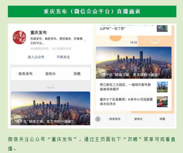 微信关注公众号“重庆发布”,通过主页面右下“双晒”菜单可观看直播。