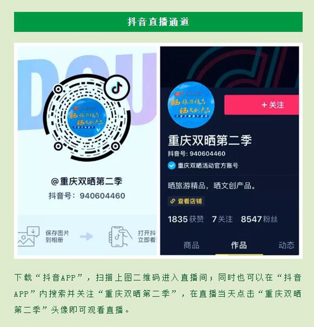 下载“抖音APP”,扫描上图二维码进入直播间;同时也可以在“抖音APP”内搜索并关注“重庆双晒第二季”,在直播当天点击“重庆双晒第二季”头像即可观看直播。