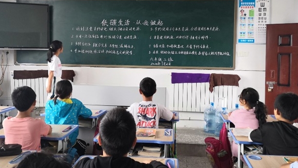 在课堂上,老师告诉孩子们7月2日为“全国低碳日”,并把此次活动分为几个环节开展,首先让大家观看了关于“低碳生活”短片,然后让孩子们对自己所知道的低碳环保知识大胆发言分享,并说说自己平时在生活做了哪些不低碳的事。最后,通过学习和了解,孩子们知道了人们在生活和消费过程中的过量碳排放,是造成全球气候变暖的重要因素之一,气候变化与我们每个人都息息相关。六年级的几名学生说:“通过今天的学习,我们会从自己身边的细节做起,成为“低碳达人”,保护我们这个赖以生存的地球家园,让人类可以尽情享受大自然赋予我们的幸福!”
