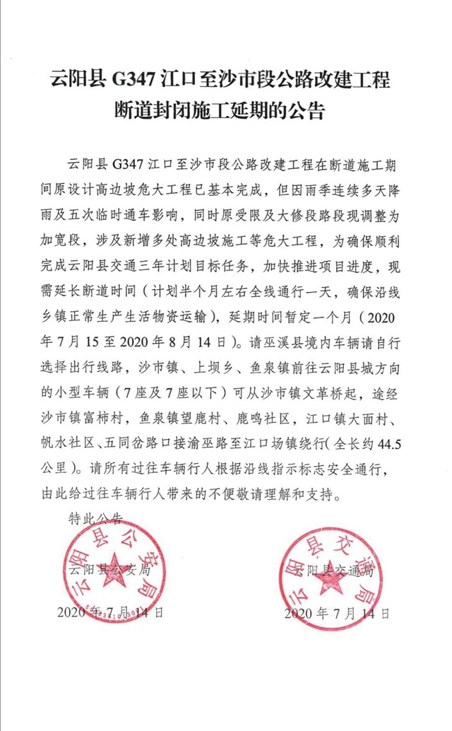 云阳网讯(记者 陈爱玲 徐锐)7月14日,记者从相关部门获悉,云阳县G347江口至沙市段公路改建工程在断道施工期间原设计高边坡危大工程已基本完成,但因雨季连续多天降雨及五次临时通车影响,同时原受限及大修段路段现调整为加宽段,涉及新增多处高边坡施工等危大工程。为确保顺利完成我县交通三年计划目标任务,加快推进项目进度,现需延长断道时间,暂定一个月,延期时间为7月15日至8月14日(计划半个月左右全线通行一天,确保沿线乡镇正常生产生活物资运输)。