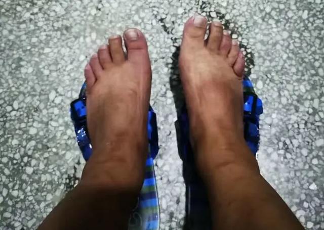 由于在水中长时间侵泡,杨胜前回到宿舍脱下鞋,十个指甲已经被水泡得发白。