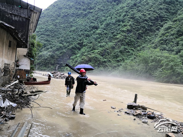 “由于基础滑坡,该村10千伏倒杆就有5基,昨天由于大暴雨板板桥处溪水猛涨,多处出现道路塌方,无法达到现场。今天,我们淌水过河,带着工具和材料徒步来到这里。”江口供电所片区负责人王敬一边组织人员清障一边讲到线路受损情况。