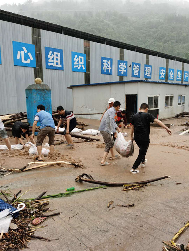 由于拌和站桥梁涵洞处有上游泥沙、树渣堆积,排水不足,水位上升地面淹至人体膝盖处,工区救援人员被急流分散。梁鹏、牛庆、谭杨辉、孔凡与副总工丁辰昱、试验室主任黄才建组织各管理人员与劳务队人员,手牵着手,互相搀扶支撑,按应急方案分别用沙袋堆码堤坝。同时出动挖机来疏通河道、出动铲车推除围栏引流。暴雨还在继续,沙袋码好后又被冲走,梁鹏紧急决定用装载机运送沙袋和救援人员,大家团结一心,在暴雨、急流和滚石的轰鸣中排险疏通。至19时,虽工区进入停水停电,但已完成全体人员疏散,水位开始下降。