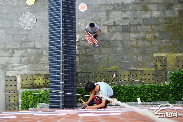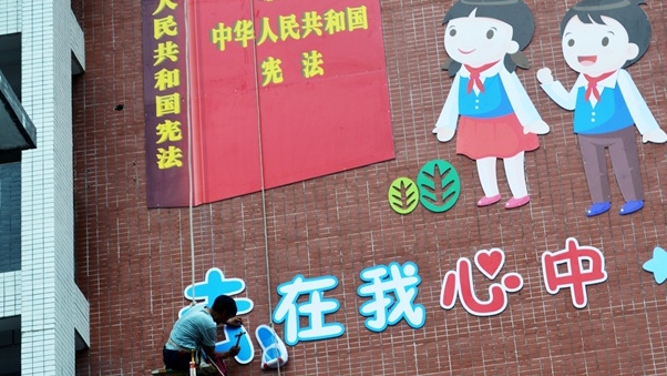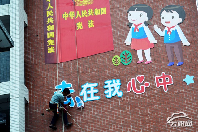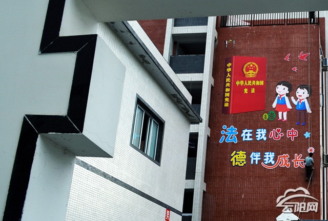 云阳网讯(通讯员 胡静波)7月24日,云阳县彭咏梧小学施工人员正在涂装一面以《宪法》为主体风格的校园文化墙。由此,全县第一个“青少年法治教育基地”启动建设。