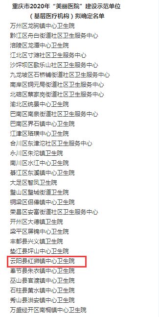名单显示,全市共有30家基层医疗机构拟被认定为重庆市2020年度“美丽医院”建设示范单位。其中,我县红狮镇中心卫生院榜上有名。