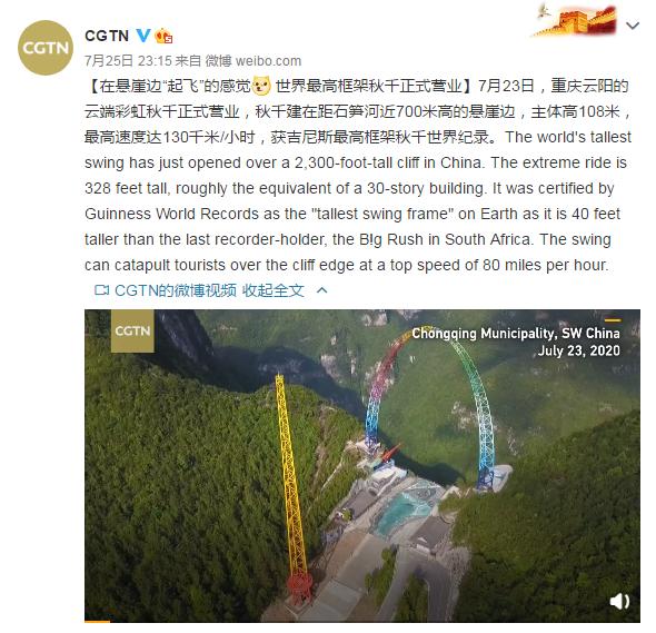 中国国际电视台CGTN也对云端彩虹秋千进行了报道。