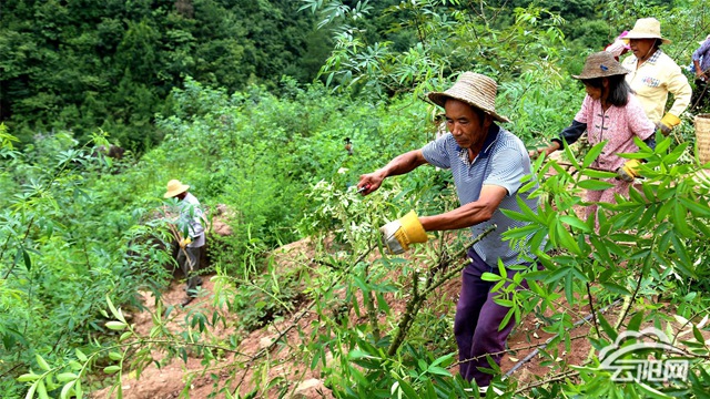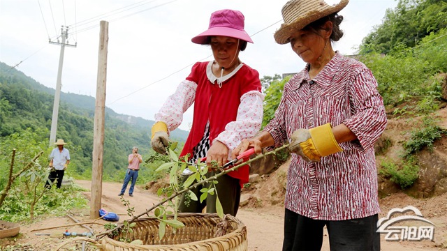 七月,花椒采摘进入尾声,平安村村民李孟兰正和大伙儿一起采摘最后一批花椒,并给花椒树修枝。