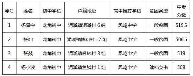 根据中共重庆市委宣传部、重庆市精神文明建设委员会办公室、重庆市教育委员会关于《开展重庆市2020年圆梦助学行动的通知》(渝文明办〔2020〕9号)文件要求,面向我县深度贫困乡镇(泥溪镇)的困难初中毕业生开展公益性助学行动,根据学生家庭困难情况、在校期间学习情况和品德表现,推荐并上交《重庆市2020年圆梦助学生行动申请审批表》。县委宣传部、县文明办、县教委对申报材料进行审核后,确定出符合条件的4名拟助学名单,现公示如下: