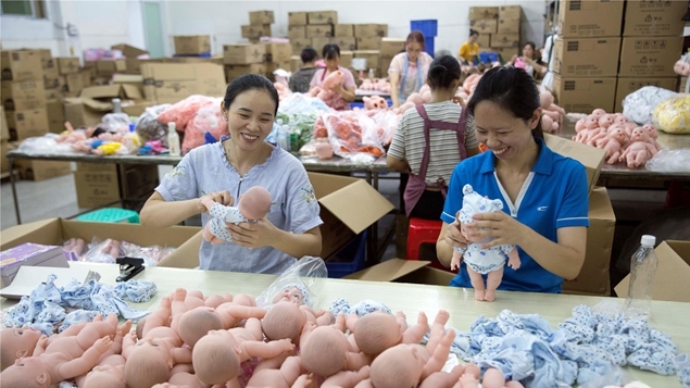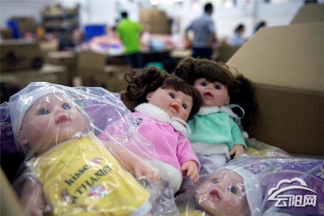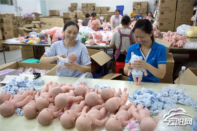 7月31日,工人在高阳镇返乡创业园优多科技有限公司给玩具娃娃完成穿衣服、包装等工序。