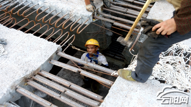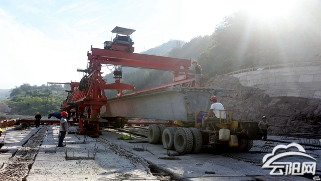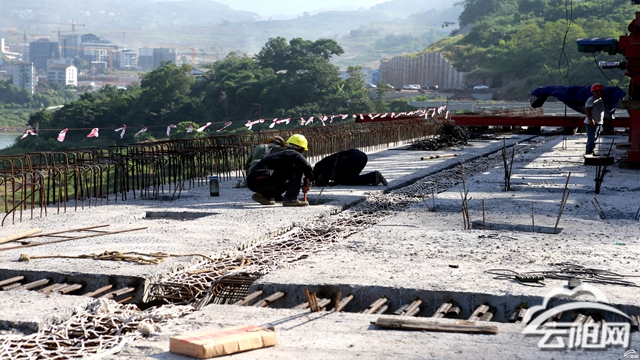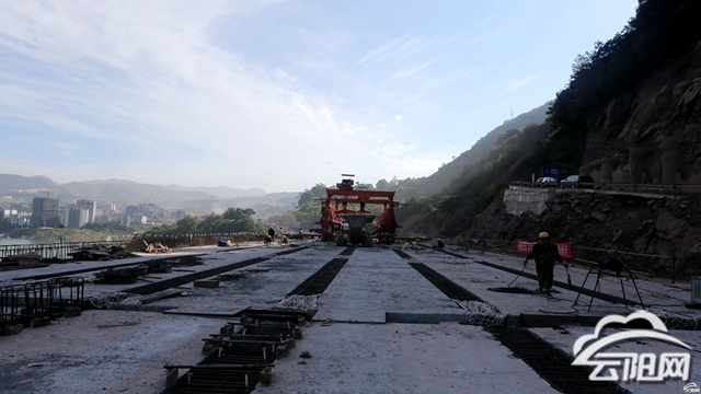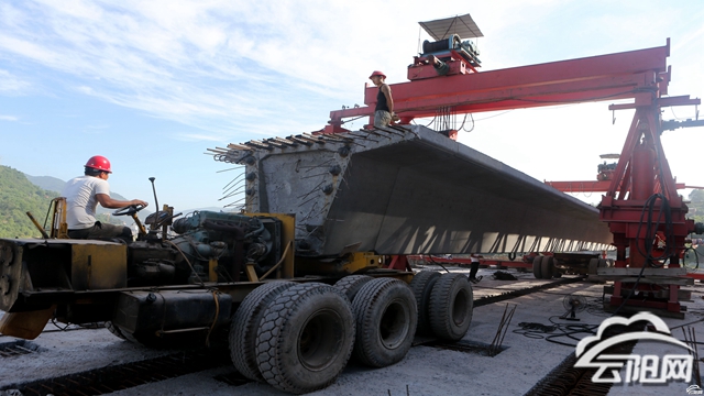 云阳网讯(记者 李充 实习生 李歆宇)8月9日,长河一号大桥施工现场,工人师傅正在紧张作业,运梁设备车正在将预梁板这个庞然大物小心翼翼送进卡口中,整个工地一片热火朝天建设景象。
