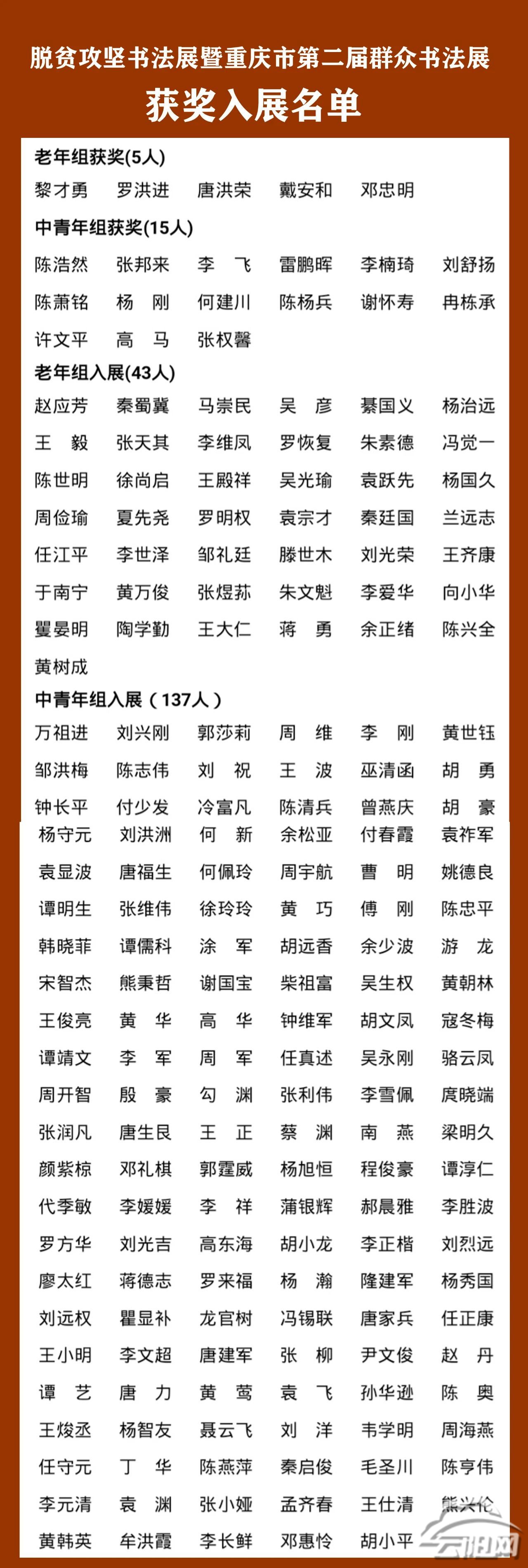 云阳网讯(记者 何竞嘉 邓庭庭)近日,脱贫攻坚书法展暨重庆市第二届群众书法展名单公布。经过多名评审公平公正的严格评审,最终评出212件参入展候选作品,含获奖作品20件。其中,云阳有1件作品获奖、5件作品入展。