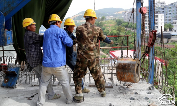 烈日下,来自万州的钢筋工程师傅正和工友们进行钢筋拉张作业,运送设备,连接高压油泵与千斤顶……每做一个动作,每一次移动身体,汗水就像下雨一般纷纷滴落。