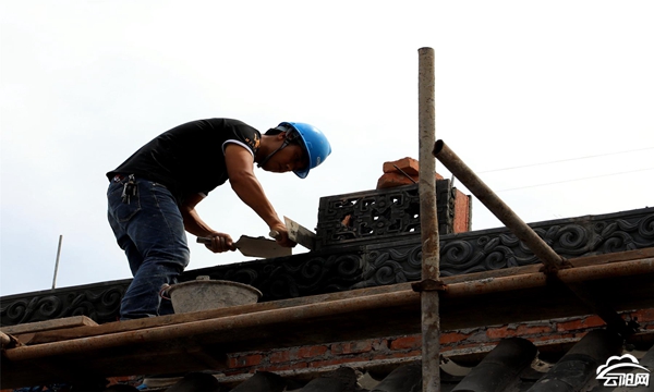 胡兴流从事屋面装饰工作多个年头,他和工友们正在进行屋面装饰盖瓦和屋脊贴花瓣等工序。胡兴流说:“屋面施工最重要的是注意安全,特别是到屋脊外面做活儿,必须把安全带、安全帽佩戴上。屋面施工作业也是一个精细工艺活,一点也不能马虎,在做好安全措施的同时也要克服高温,保证工程质量。”