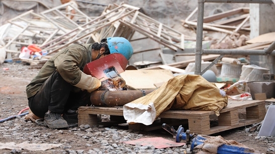 “这是气保焊罐,焊梁的,有一百多斤呢。”来自山西的电焊工人刘明明,正双手用力移动气保焊罐,汗水早已湿透衣背。