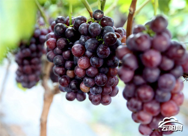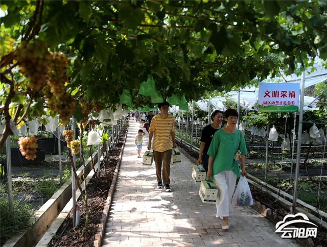 据介绍,云阳·威海多集合现代农业产业园位于凤鸣镇马轩村,由云阳县、威海市共同建设而成,是东西部扶贫协作的重要成果之一。产业园总投资5000万元,现已完成投资3000万元,占地2000余亩,建成标准插地棚136个、面积33000平方、温室大棚5000平米。该产业园主要生产各类绿色蔬菜、水果和生态鱼,在特色农产品生产、优良品种选育、生产标准试验示范、现代农业科技培训推广等方面效果明显,已逐步发展成规模大、种类全、质量好的现代农业产业园。今天开园的葡萄园约60亩,种植有阳光玫瑰、浪漫红颜、夏黑、美人指等9个品种。