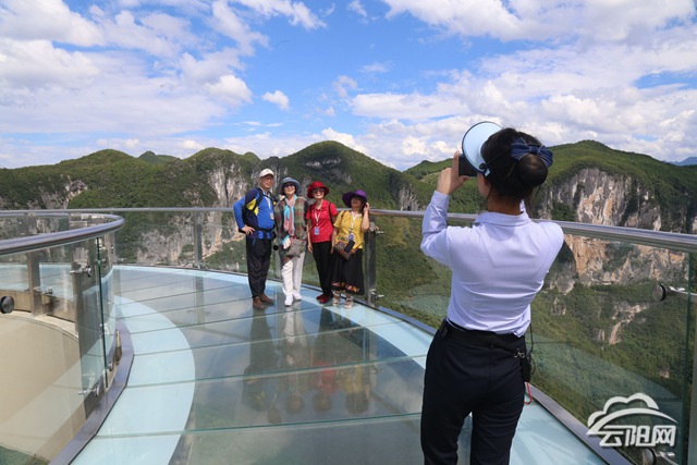 来到龙缸景区内,吴秋蓉带着游客体验世界最长悬挑玻璃廊桥的惊心动魄。游客踏足廊桥,不管是前后左右还是上下观景,都没有任何视线遮挡,浑然“凌空悬浮”一般。