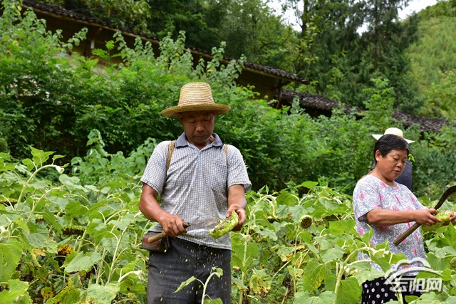 贫困户孙祥玉平时在油葵种植基地务工,100元/天的务工费令她十分满意,“没想到我年纪这么大了,还能在家门口挣钱。”这几天,海拔较低的油葵花已经凋零,颗粒饱满的油葵籽正等待着收割,趁着天气晴好,孙祥玉和工友们正高兴地忙碌着。为了带动更多村民发展油葵产业,增加增收渠道,红椿村的村干部带头种植,综治委员王会军今年就种了20多亩,成了油葵种植大户。