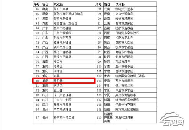 云阳网讯(实习生 李歆宇)近日,农业农村部公布110个“互联网+”农产品出村进城工程试点县名单。其中,重庆市6个,云阳榜上有名。