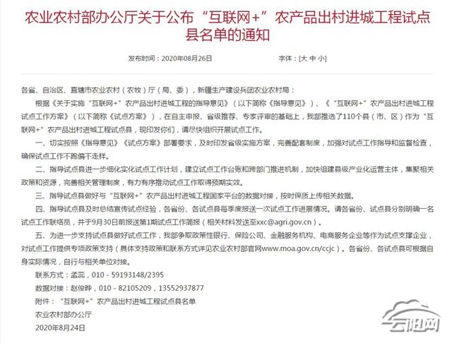 目前,根据相关要求,在自主申报、省级推荐、专家评审的基础上,农业农村部推选了110个县(市、区)作为“互联网+”农产品出村进城工程试点县,要求尽快组织开展“互联网+”农产品出村进城工程试点县试点工作。