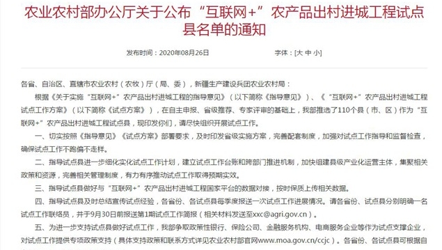 今年,经国务院同意,农业农村部会同国家发展改革委、财政部、商务部印发了《关于实施“互联网+”农产品出村进城工程的指导意见》。意见提出,要优先选择包括贫困地区、特色农产品优势区在内的100个县开展试点,到2021年底,基本完成试点建设任务。通过试点,探索形成一批符合各地实际、可复制可推广的推进模式和标准规范,向全国推广应用。