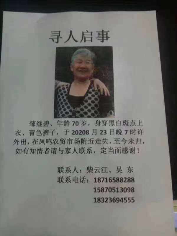 邹继碧,年龄70岁,身穿白色斑点上衣、青色裤子,于2020年8月23日晚7时许外出,在凤鸣农贸市场附近走失,至今未归,如有知情者请与家人联系,定当面感谢!