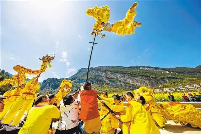 ▲丰都县暨龙镇乌阳坝村举办的油菜花节上,当地村民玩龙舞狮欢迎游客到来。陈勇 摄/视觉重庆