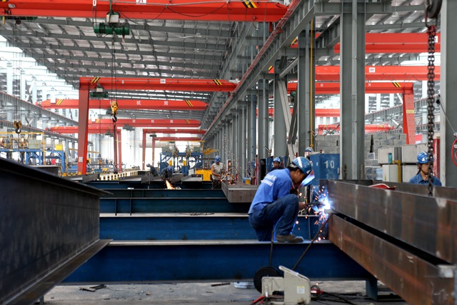 8月31日,云阳诚信杭萧钢构产业园内,机器轰鸣、焊花四射,各条生产线高效运转,工人师傅全神贯生产,整个车间内呈现出一片热火朝天的景象。