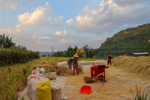 8月31日,盘龙街道石楼村村民用绞稻机“打谷子”,田间一派忙碌的景象。