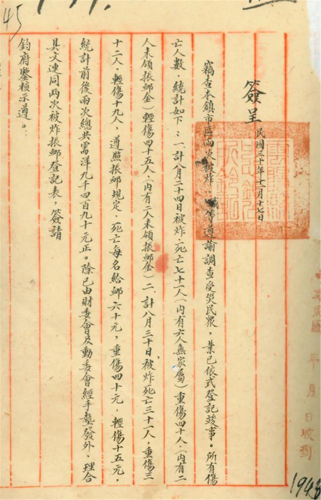 据1941年档案资料中的一次记载:“四川省振救会来函称:查贵县1941年8月2(冬)日、12(文)日、24(敬)日、30(……)日云阳县城和云安盐场遭受敌机连续轰炸后,本会向财委会施行紧急救济,计被炸四次,死亡158人,每人各发洋60元;重伤110人,每人各发洋40元;轻伤112人,每人各发洋15元”……