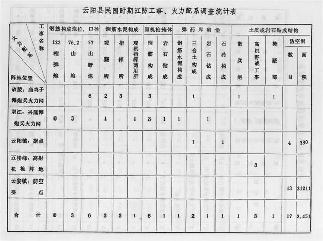1939年县政府成立江防巡查队,制定江防巡查预算书及规划。首先抽调大批人力物力加强江防工事,预防日军沿长江向四川进攻。云阳作为夔巫要塞区的一部分,县政府分别于1939年、1940年、1944年大规模赶修江防工事。江防工事以县城为支柱,以故陵、小江、五峰山、云安场为防御点。兵力装备部署为:从县城起,沿江下游22.5公里的故陵庙矶子滩至34公里处的石笋河(长滩河)出口一段。沿江两岸为一炮兵火力网,驻海军陆战队一个炮兵连;上游30公里的盘沱经红河溪至42.5公里的澎溪河口太公沱,下至兴隆滩一带为一炮兵火力网,驻一个加强炮兵营(增加一个高射机枪连)。炮兵阵地平时驻1-2个警戒分队。其余驻小江桂花湾一带;五峰山为高射机枪防御阵地,驻防一个排与故陵、小江炮兵阵地火力网协同担任对空防御。为加强对云安盐场的对空防御,在汤溪河白水滩--美人滩沿岸构筑对空防御体系。1940年,全县建碉堡116座。至抗日战争末期,全县共修筑火炮工事17个,弹药库4个,重机枪工事7个,掩蔽部1个,观察哨所44个,防空洞9个。其中云阳2个,可容纳5500人;云安7个,可容纳2500人。
