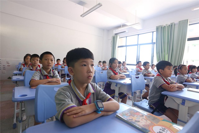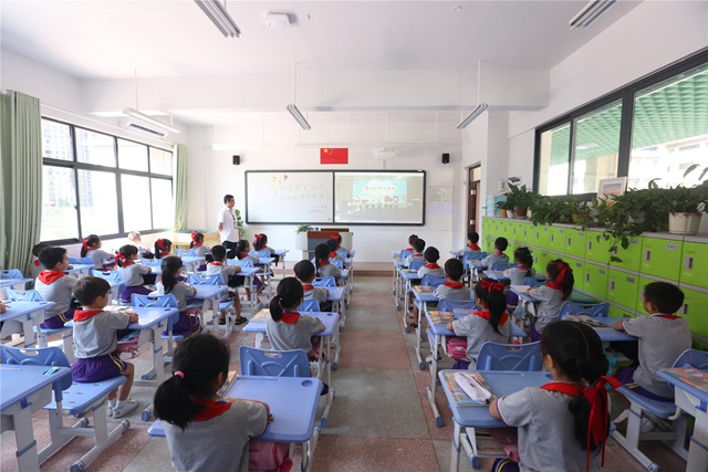 开学典礼以直播方式进行,主会场设在学校向上剧场,各班师生在教室观看实况。