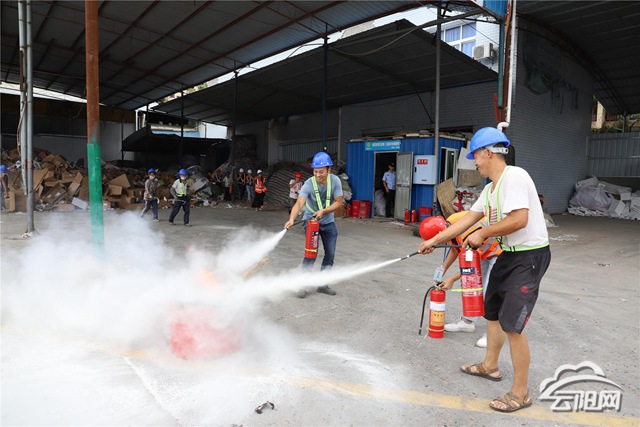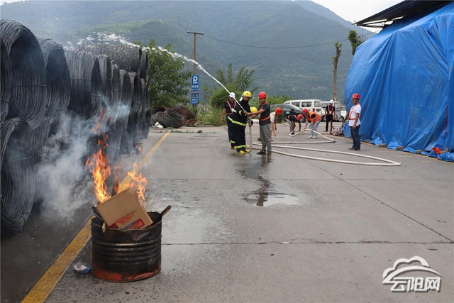 演练模拟云阳港务站下岩寺码头内零散纸壳失火,火势蔓延,引燃其他已经打包成件的废纸壳。仓库员工发现火情后大声呼救,就近取用灭火器灭火,同时向值班负责人和长航公安报告,紧急疏散员工。废纸壳燃烧速度极快,明火蔓延迅速,紧急赶到的民警和企业员工打开消防栓,合力将火扑灭。