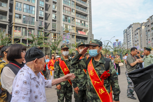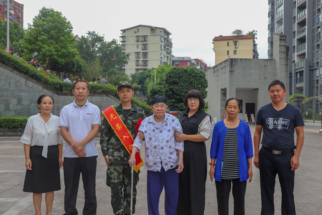 云阳网讯(记者 刘太兴 徐磊磊 实习生 谭启文)9月12日,云阳最后一批参军入伍的青年响应号召启程入伍。在前来送行的人群中,105岁的肖大兴老人格外显眼,一个月前,他写下书信请求部队让刚刚大学毕业的孙子入伍,今天,他来到现场为即将启程前往青海武警部队服役的孙子加油鼓劲。