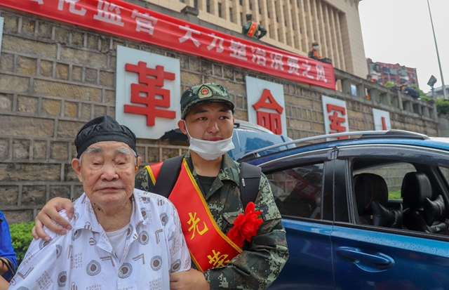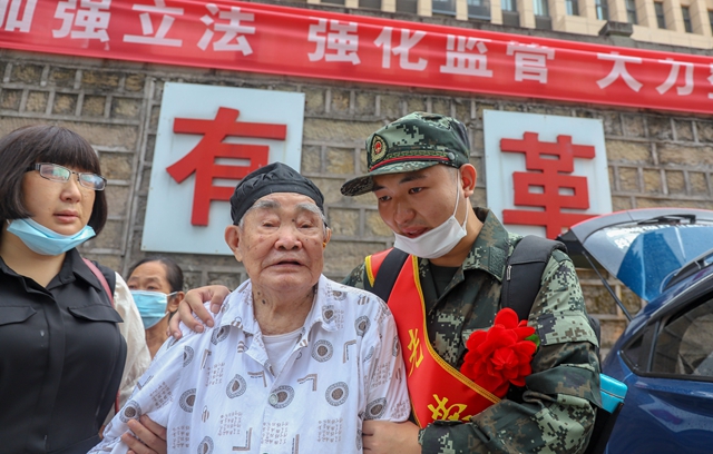 得知孙子通过层层选拔考核和体能训练,即将正式踏上前往青海武警部队的大门,老人不顾百岁高龄,专程前来送一送孙子。