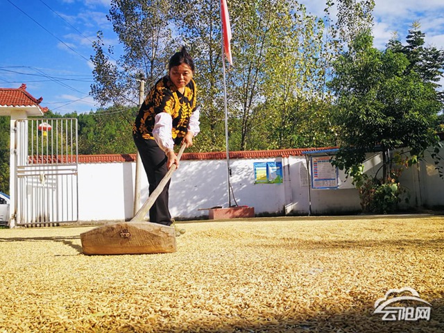 晾晒好的谷子,加完工后能卖2万多元,再加上自家养的30只鸡、2头猪,周明中的日子一定越过越红火。