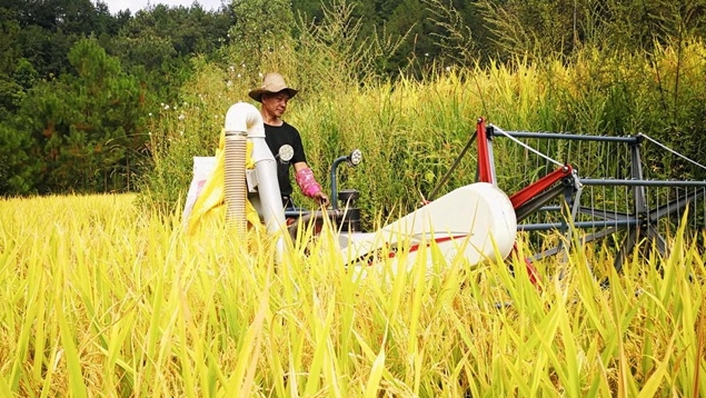 山腰上,到处都是忙碌的收割身影,耳边频频响起的“轰隆隆”声,正诉说着今年丰收的喜悦。