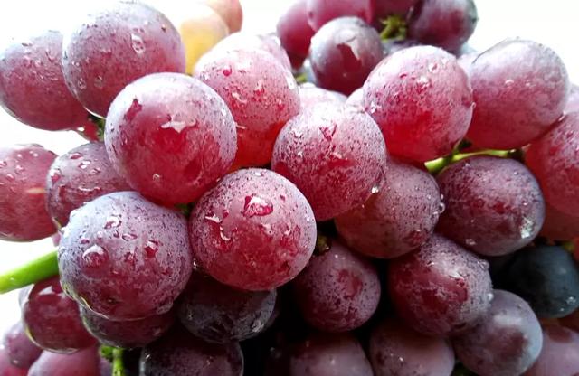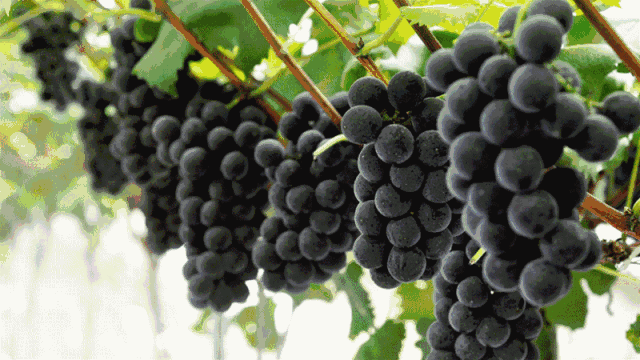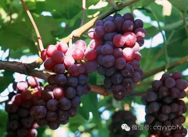 一串串紫色、红色、黑色的葡萄挂满枝头