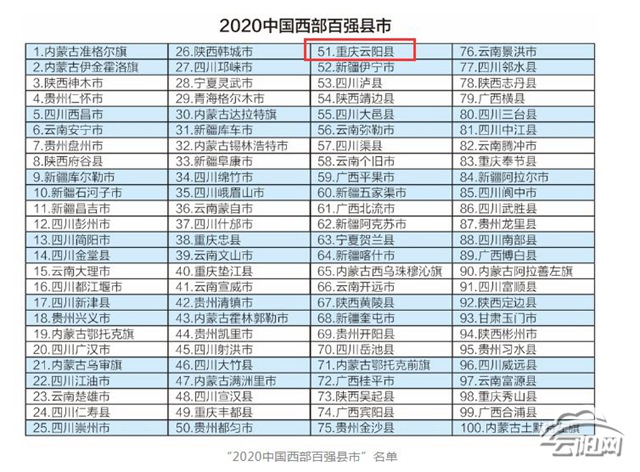 云阳网讯(记者 何竞嘉 邓庭庭)9月22日,《中国西部地区县域发展监测报告2020》(简称《报告》)发布,同步揭晓了“2020中国西部百强县市”。其中,云阳入榜中国西部百强县市,这已是云阳连续第三年入围该名单。