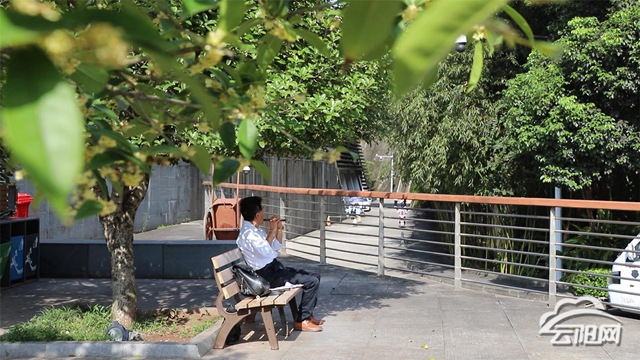 在两江广场,有市民坐在桂花树下乘凉。其间,爱好乐器的老周,在桂花树下吹起了笛子。笛声飘扬,恍若长空里万点的花瓣纷纷飘落。在月光草坪散步的市民戴流权告诉记者,今天趁着阳光明媚的好天气,出来散散步。走在月光草坪的林荫小道,闻着桂花飘香,他觉得云阳这座城市的环境特别优美,生活在这里,感觉很舒心。